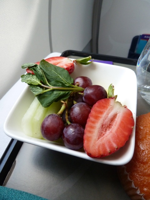 After take-off service begins with the distribution of earphones. I haven’t tried them yet, but I think they’re rather cool to look at. After that the crew come to ask what we’d like to drink and I have another guava juice, which is brought to me with a small dish of mixed nuts and berries.