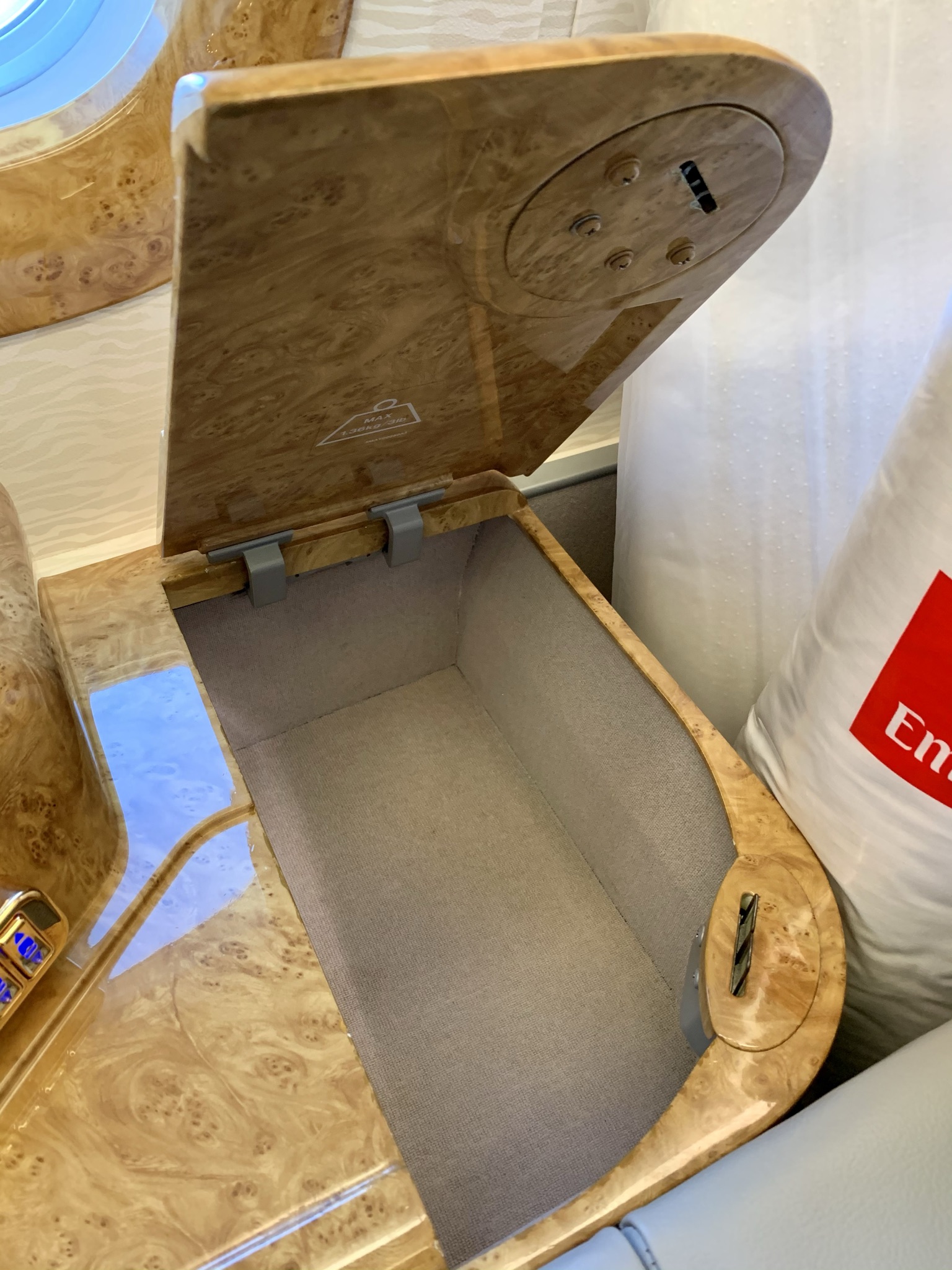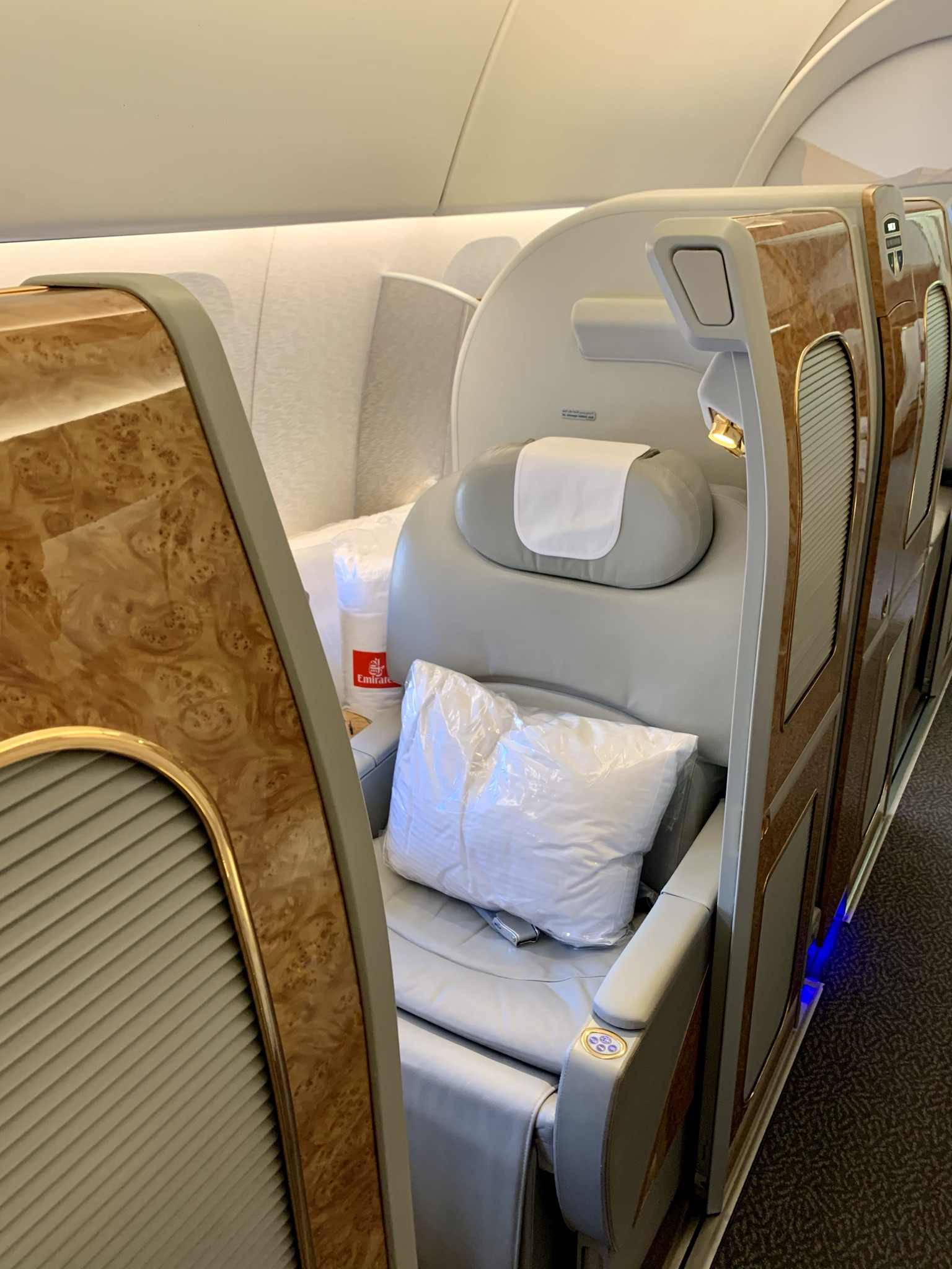 I’ve never really liked the look of the Emirates First Class cabin and seat. Generally speaking, I find the fake wood and fake gold trimmings a bit tacky. And the grey leather covers are about as bland and boring as Lufthansa. But the seat is comfortable and offers a lot of privacy and space.