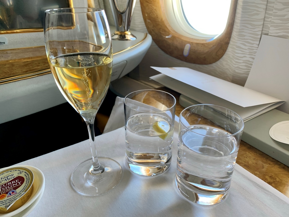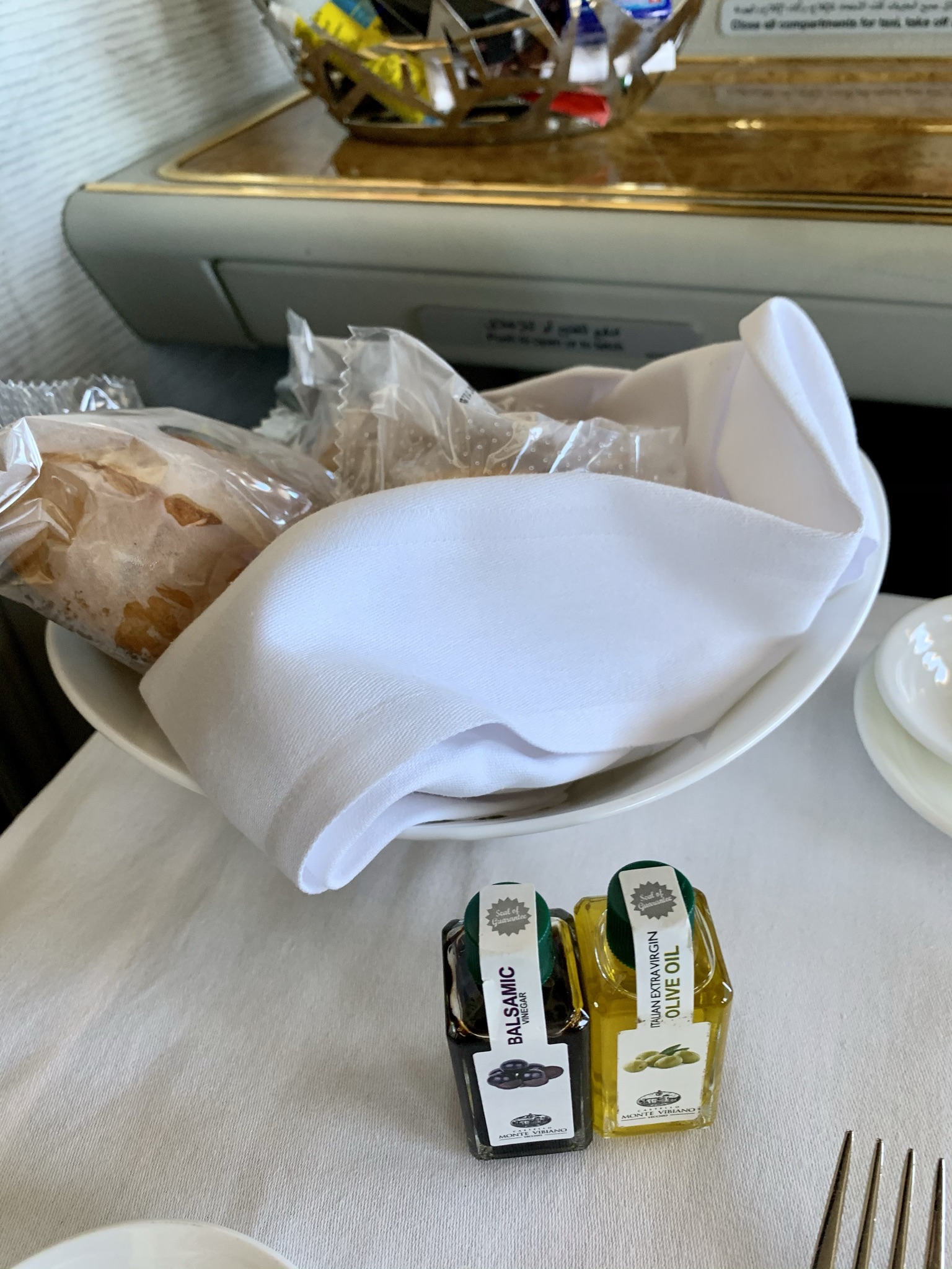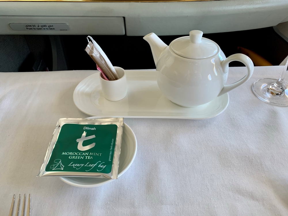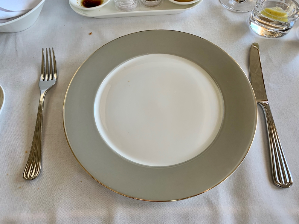 Next, the table is set for the meal. This is one area where I think Emirates could improve. The whole meal service, like the seat, it functional and on point but not really very elegant – be it in the design of the tableware or the presentation of the food on the plate.