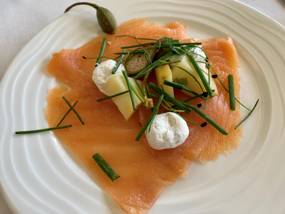For the starter I go with the cold-smoked ocean trout, served with pickled potatos, capers and crème fraîche. It’s a lovely piece of trout, but the presentation is a bit of a mess.