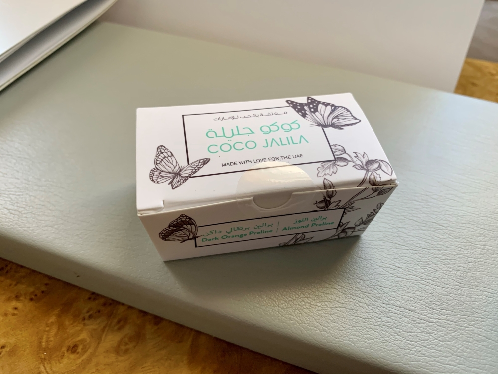 The meal concludes with a small box of Emirati pralines.