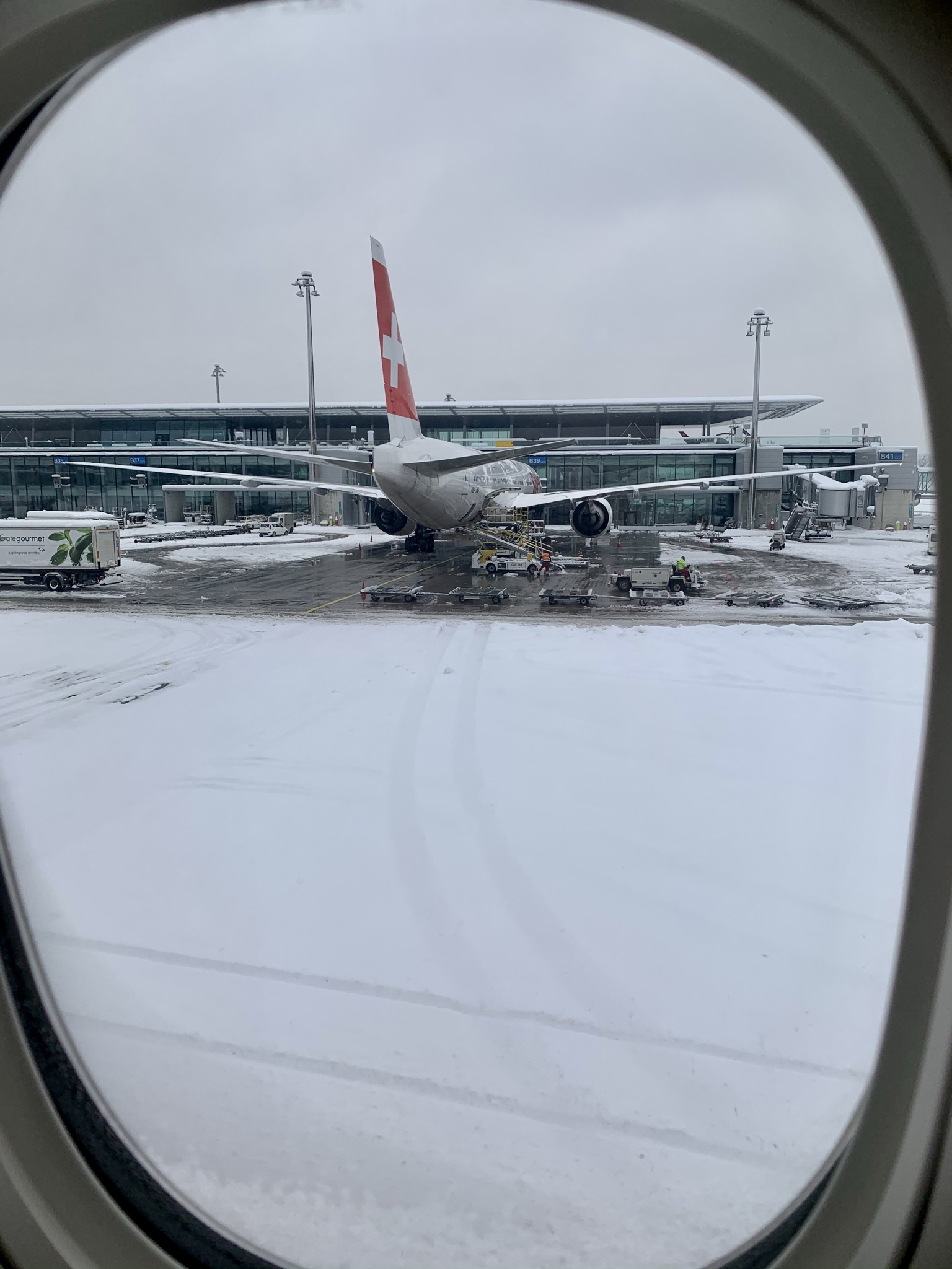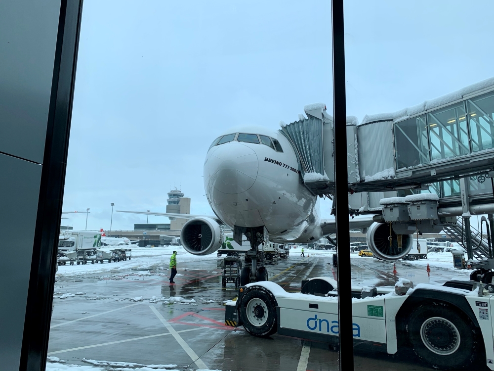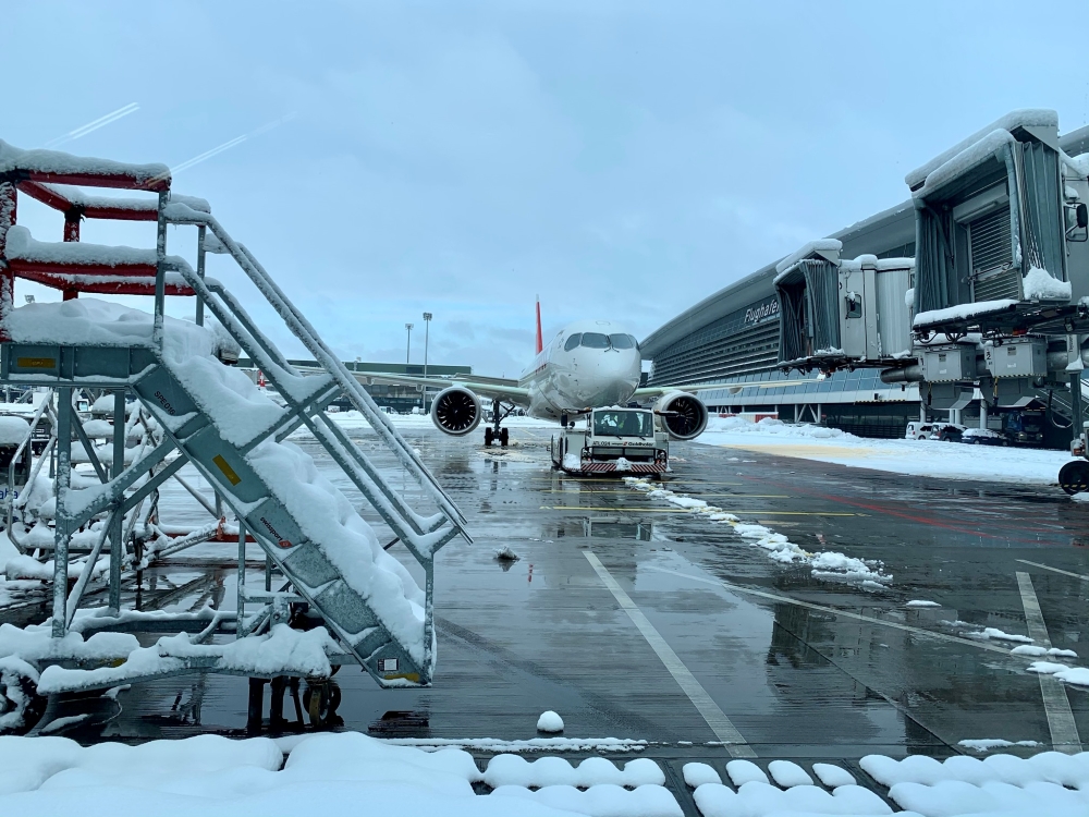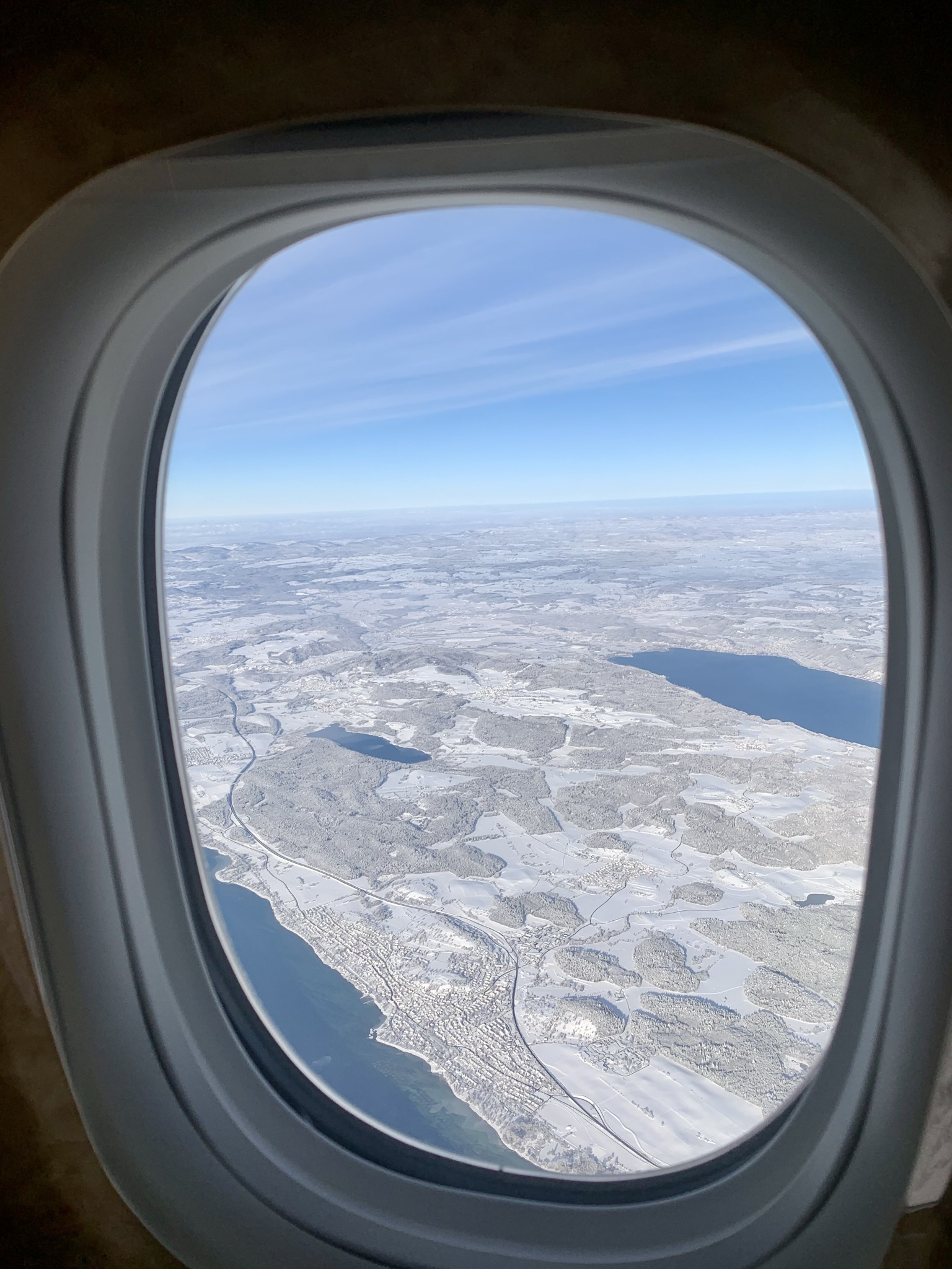 Thirty minutes out of Zürich our Spanish captain comes on the loudspeaker to inform us that we have reached the top of descent have have another half hour to run to Zürich. The temperature is minus 2 and they’re expecting it to have just finished snowing by the time we land. From above it certainly looks pretty outside.