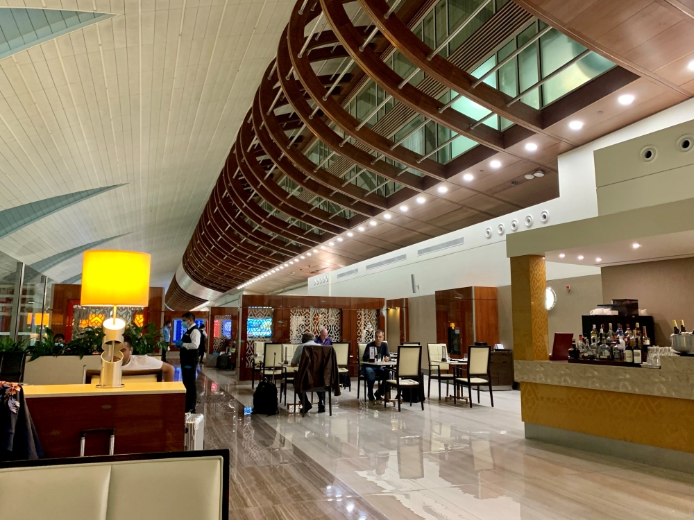 The lounges are located one floor up from the public airside area. The standard Emirates First Class lounge is temporarily closed to passengers, however. Instead, one half of the Business Class lounge has been sectioned off and converted into the First Class lounge.