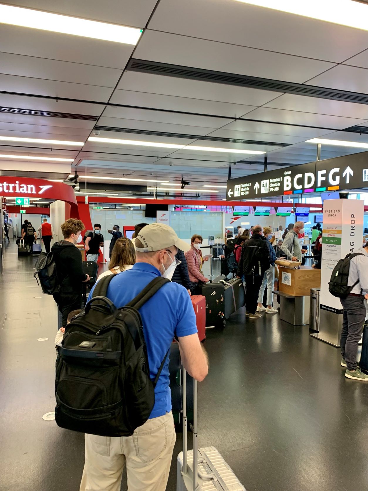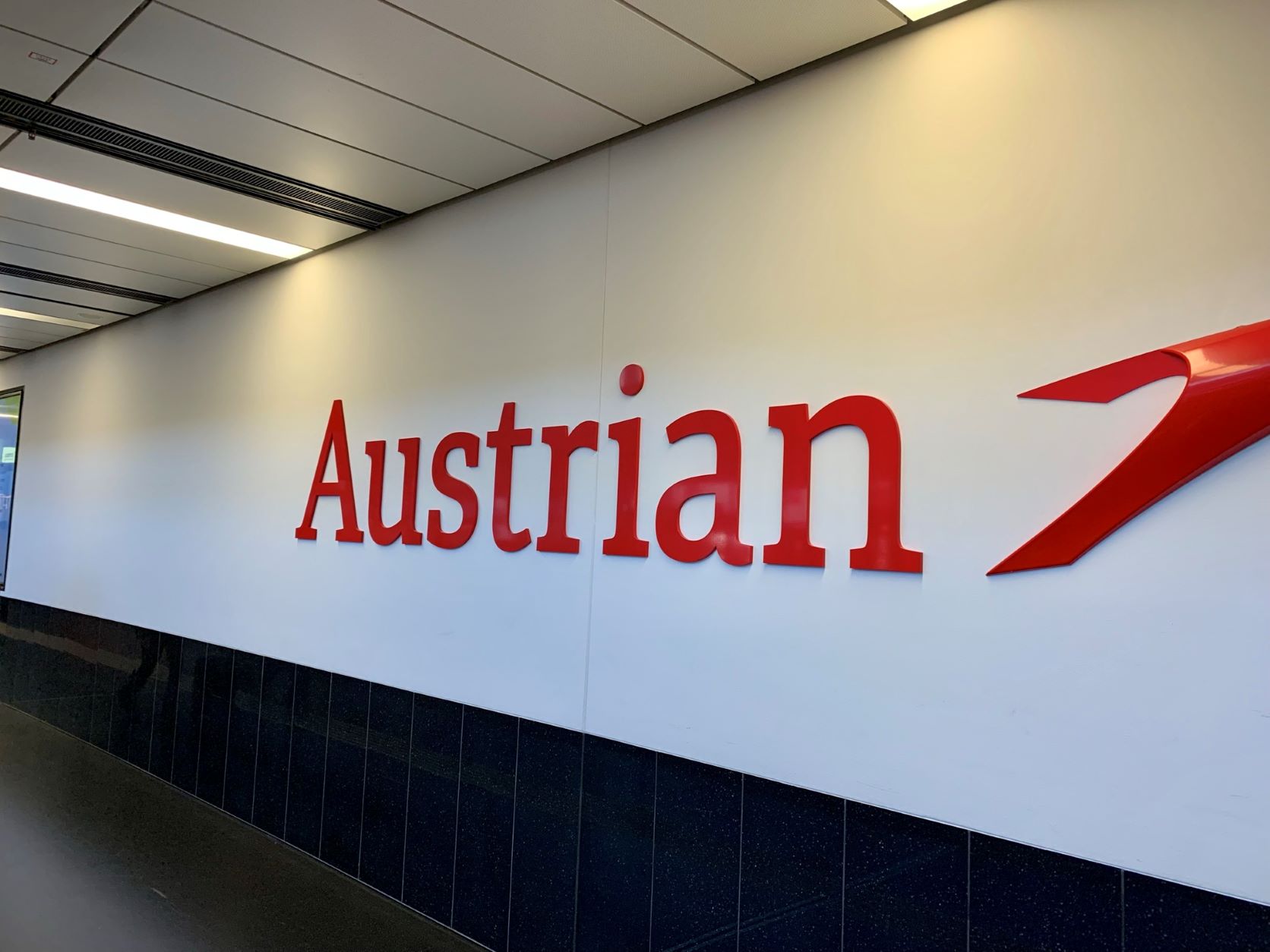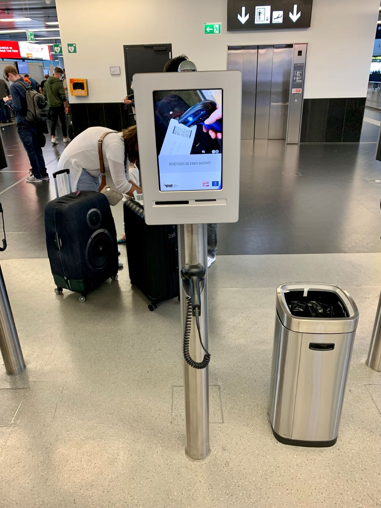 Austrian Airlines checks in at Terminal 3. I’ve already received my boarding pass online, but I still need to drop off my suitcase. Austrian Airlines’ self-check in process for Economy Class passengers is easy to use and has been well planned. As you come off the escalators that lead up to departures, there is a large area with very easy to use scanning machines.