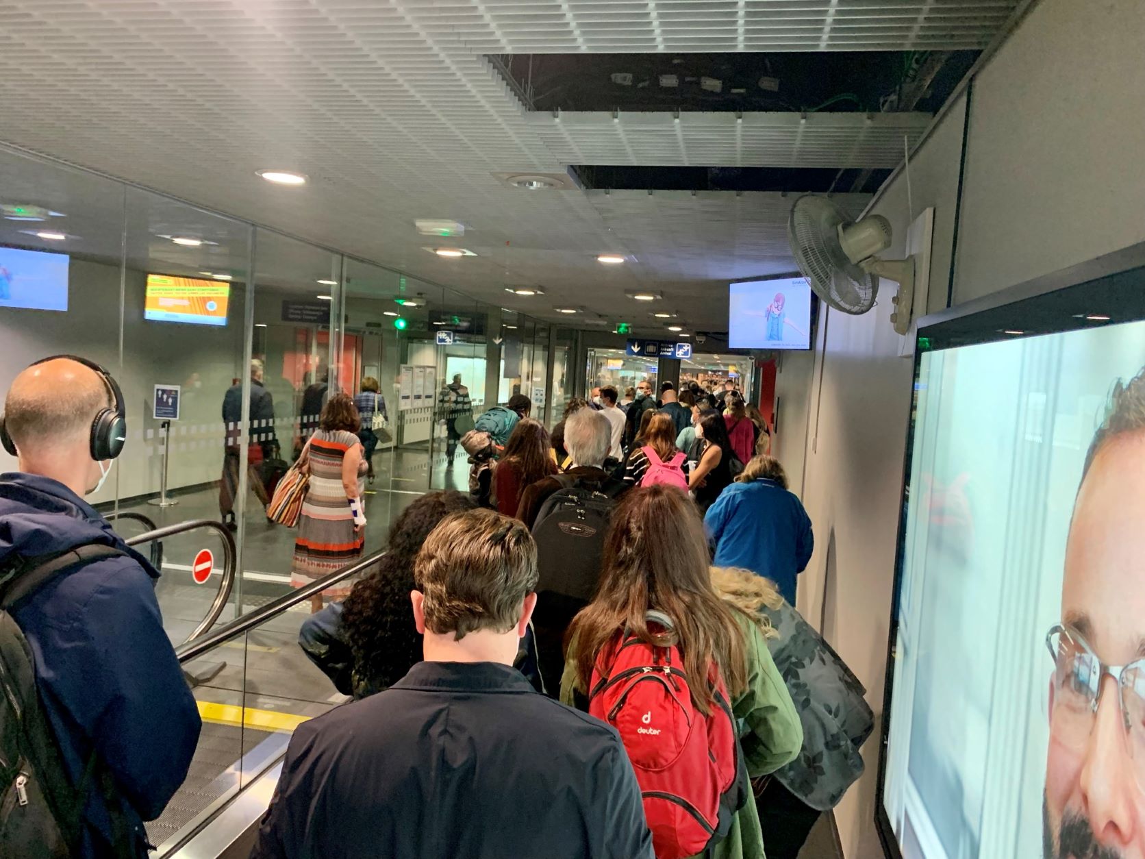 You scan your boarding pass and the machine will ask you to confirm your name. Once that’d done, the baggage label is printed. The queue for the fast bag drop is long, but at least it moves quickly.
