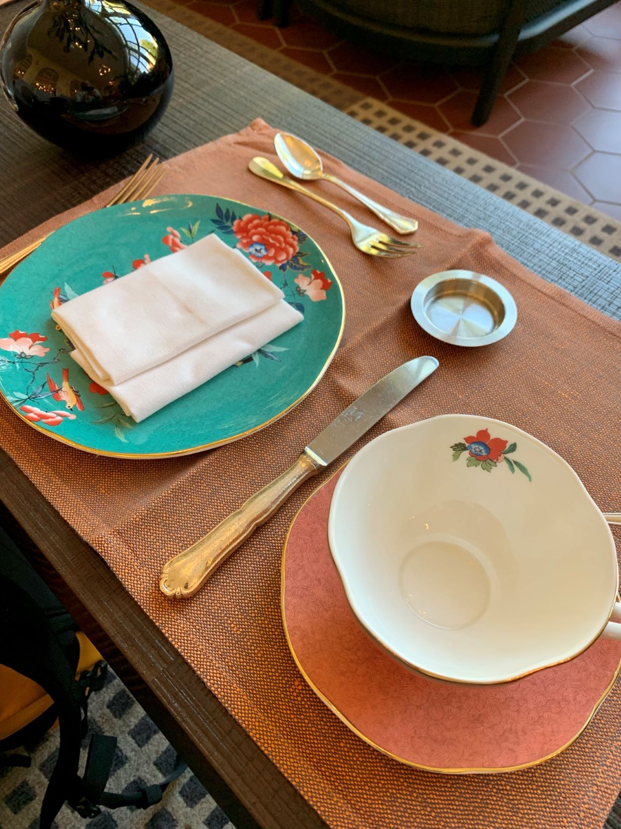 The afternoon tea is served on bright and colourful crockery.