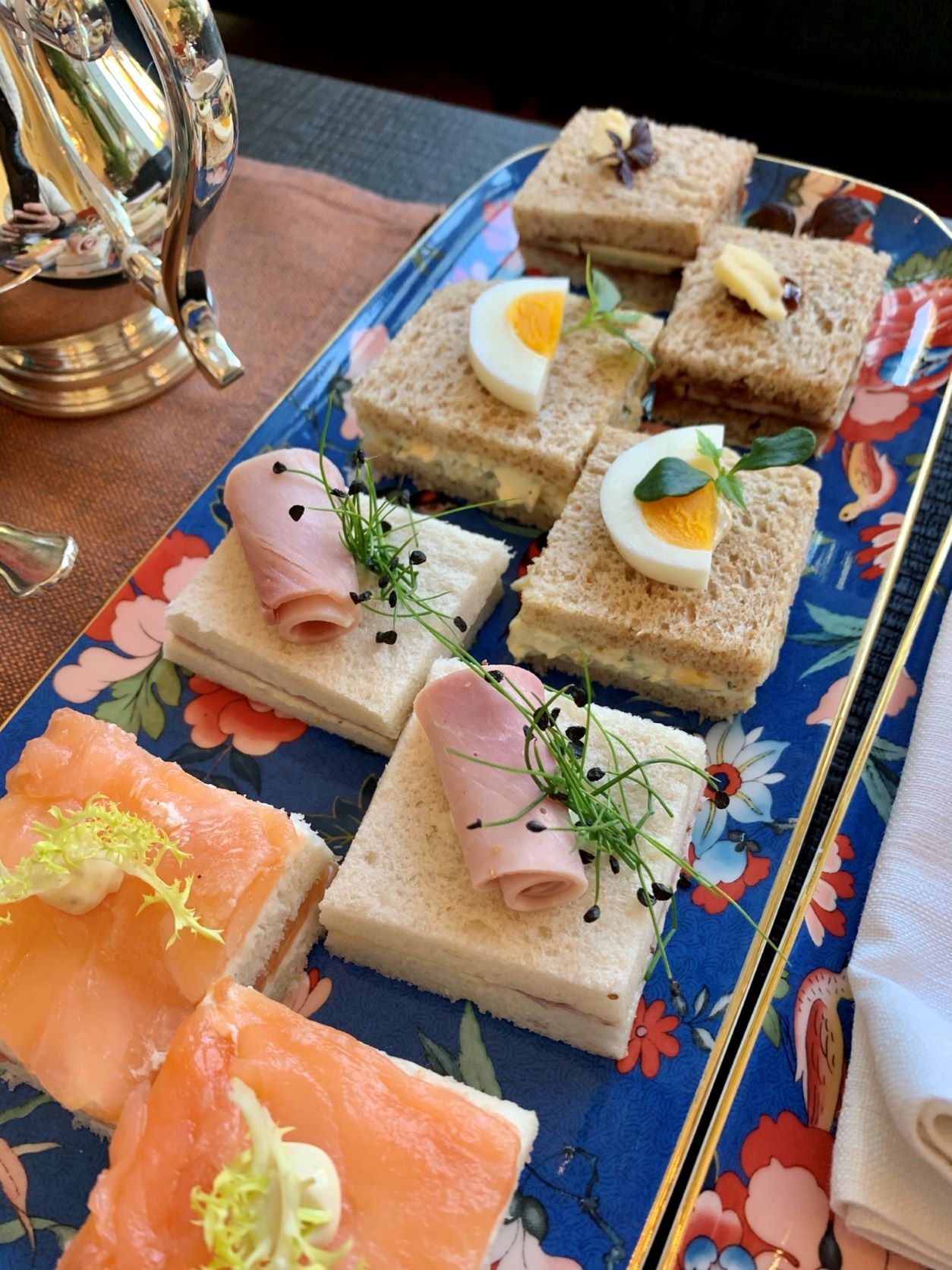 First, the sandwiches are served, and there are two squares each of four different types of sandwich: salmon, ham, egg, and cheese with chutney.