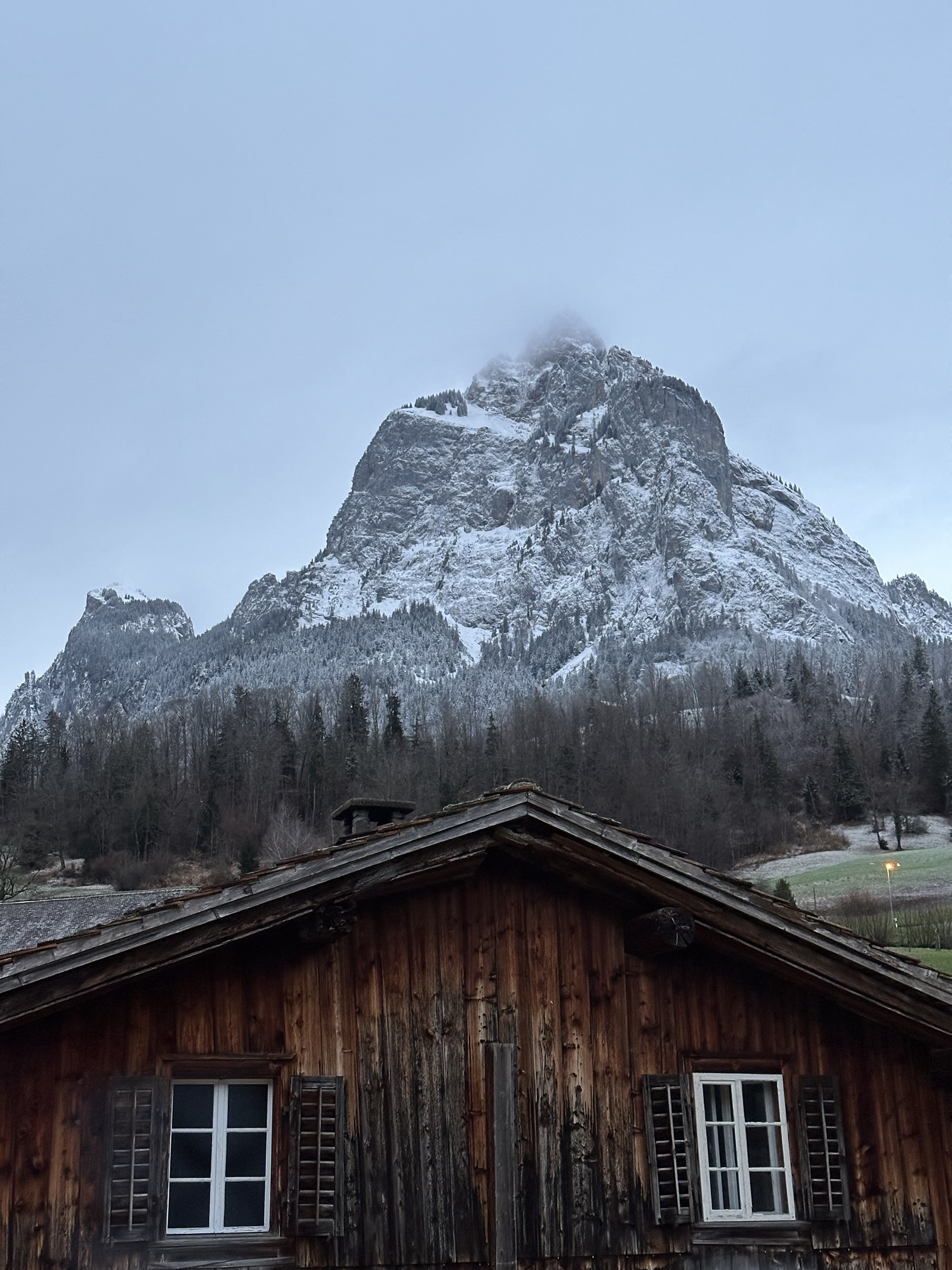 The room on the ground floor and the room I’m in on the first floor face toward the greater Mythen, which sits right outside the window and looks quite imposing- when it isn’t shrouded in a heavy cloak of clouds.