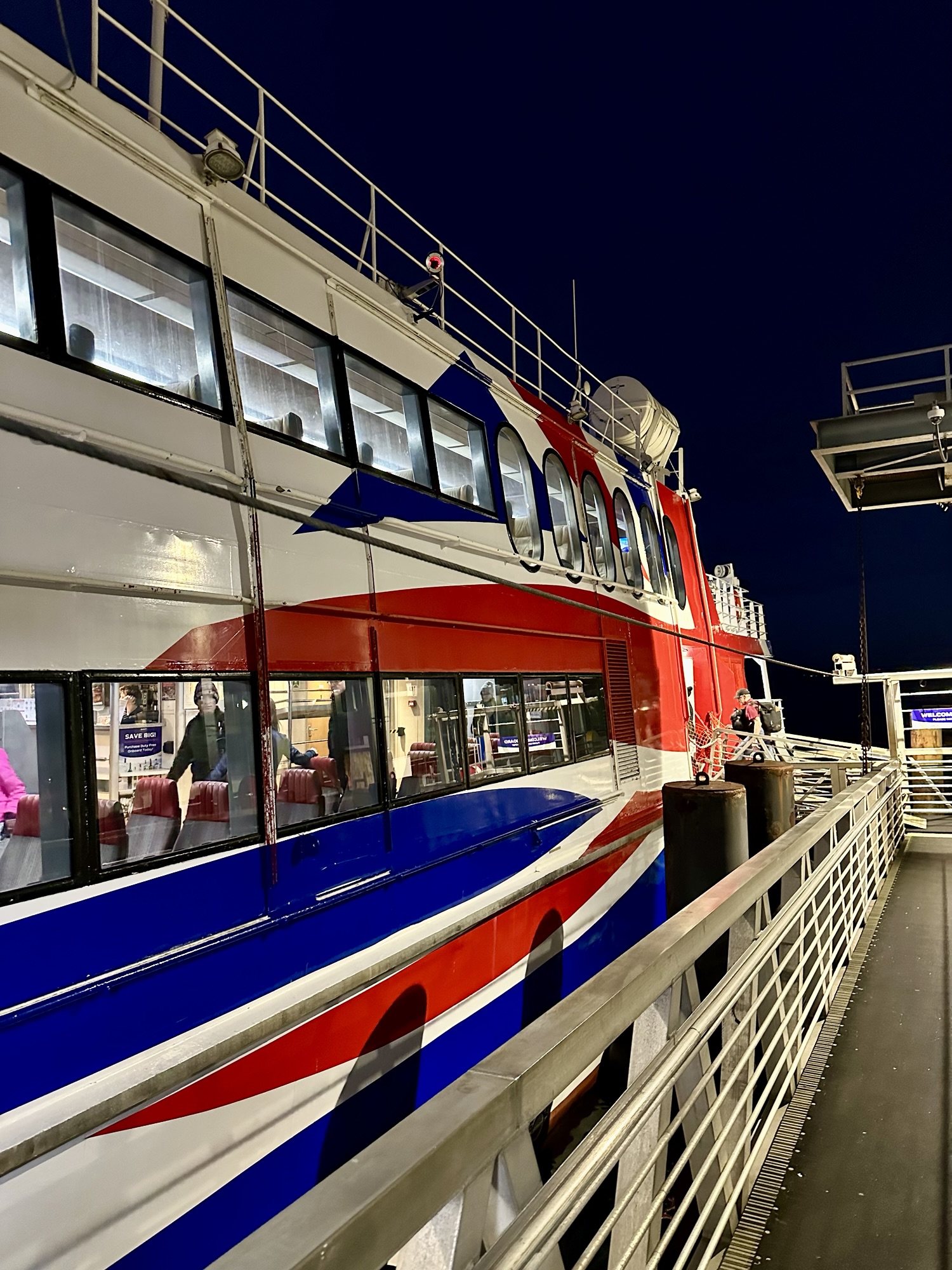 Check-in for the boat opens one hour before departure and closes twenty minutes before departure. As I’m travelling in Comfort VIP Class, I’m allowed to take my suitcase on as hand luggage, or I can check it in for free. Just a piece of advice if you’re considering taking this service: DON’T CHECK IN YOUR BAG! If you do, you will be allowed off the boat last in Victoria and end up spending a very long time queuing for immigration outside in the cold.